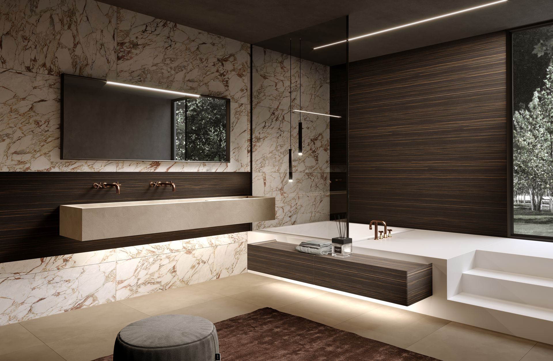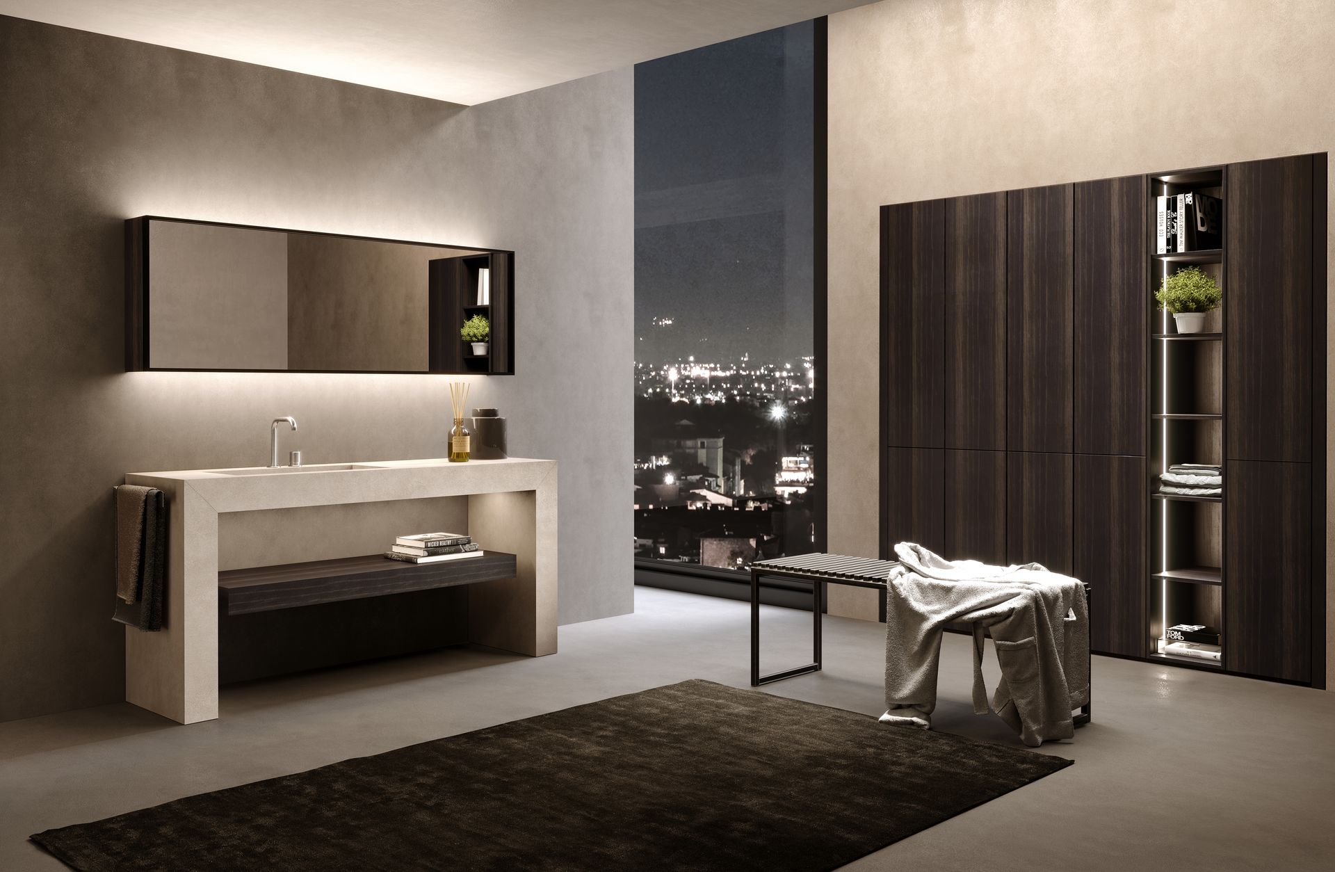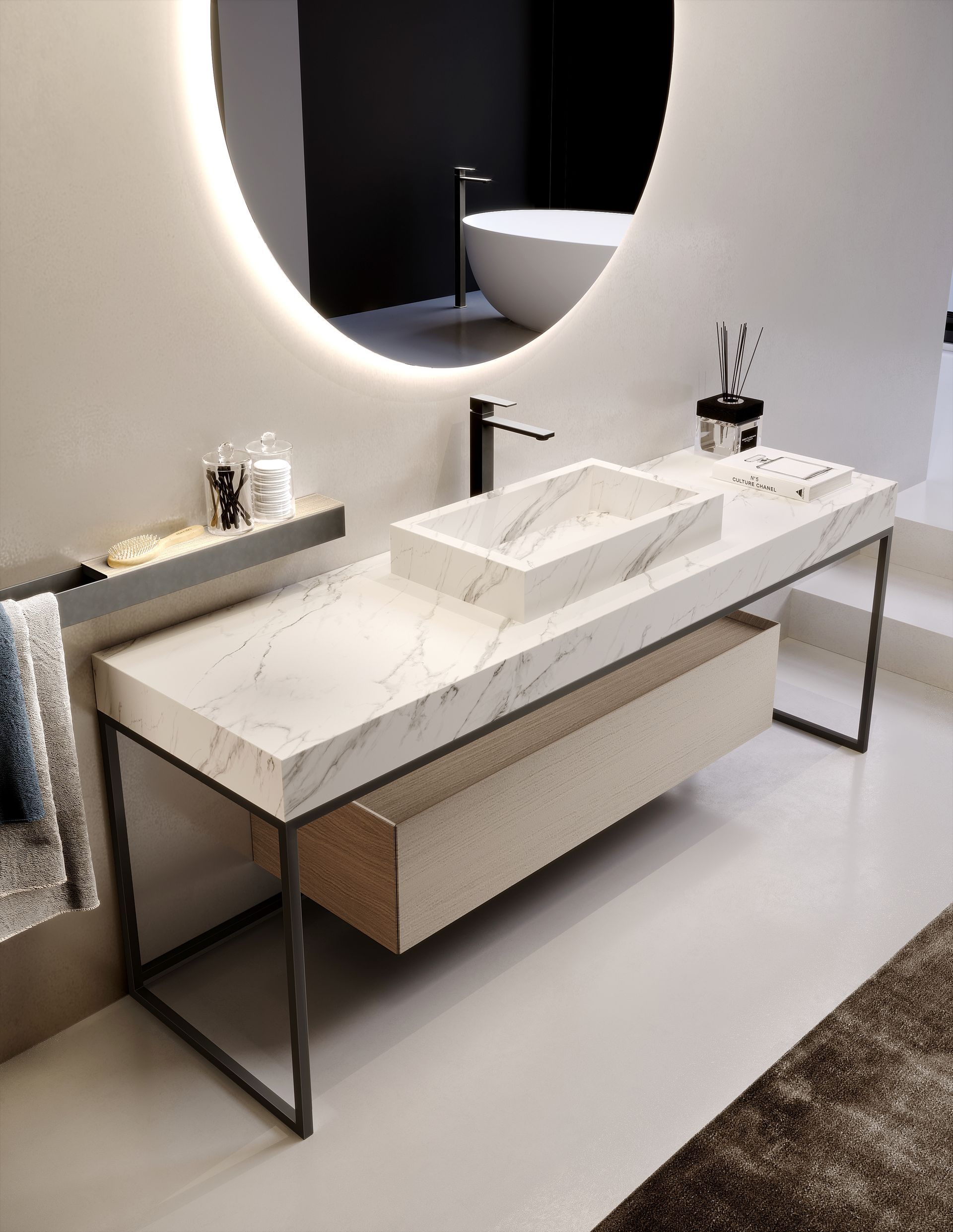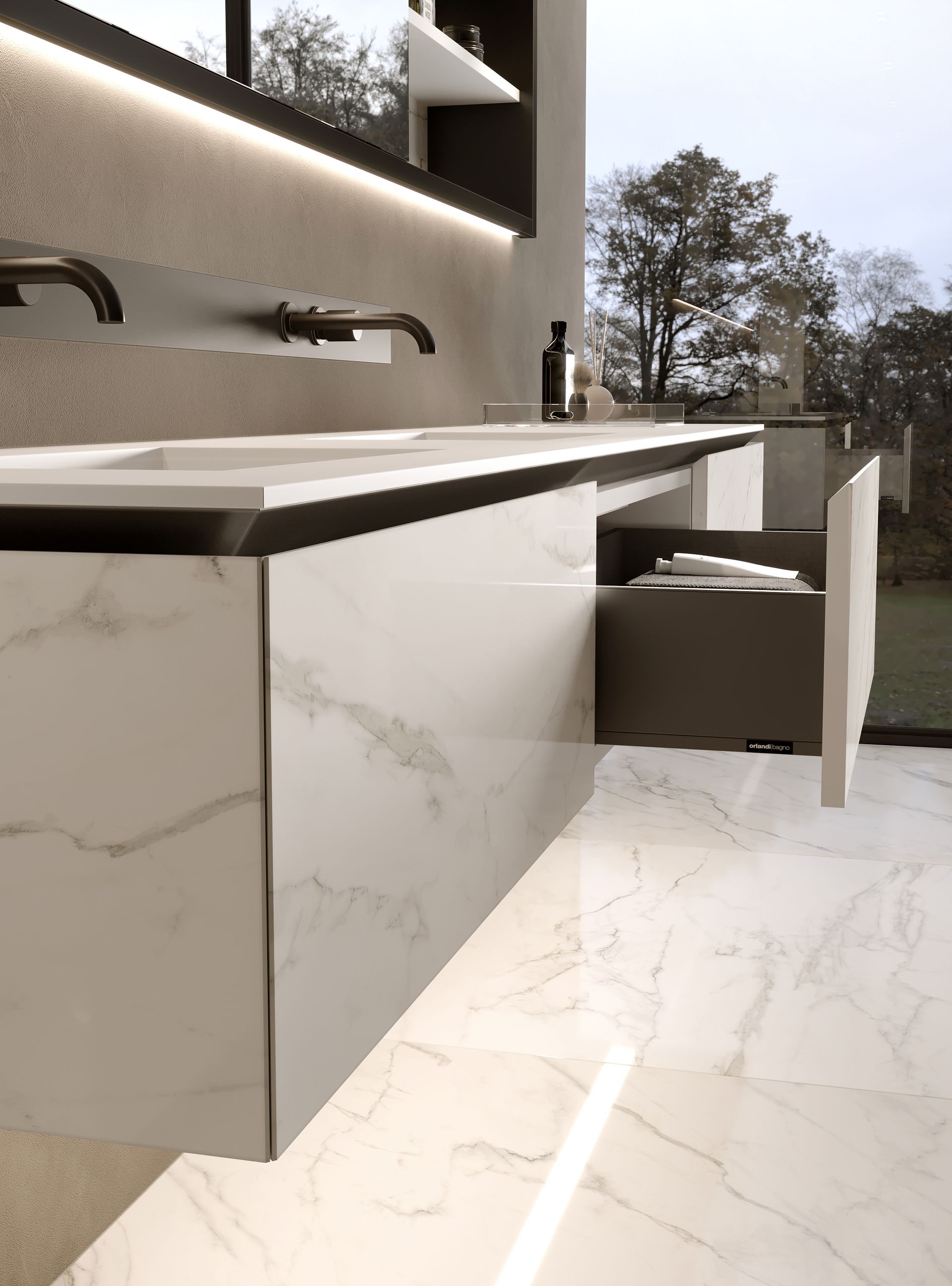 The collection can be completed with an exclusive porcelain stoneware finish, a durable, easy-to-clean material with a high-quality aesthetic. Stoneware increases the durability of the countertops and wall tiles, making the series suitable for daily, continuous use. The result is a piece of furniture that maintains its characteristics over time, without sacrificing visual or functional quality. The combination of plywood, coordinated lacquer, and stoneware creates a cohesive product, designed to meet the needs of the modern bathroom.